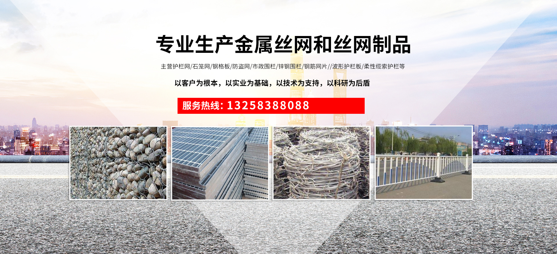 成都宏旭金属丝网制造有限公司主营护栏网系列、石笼网系列、钢格板、防盗网、市政围栏、锌钢围栏、钢筋网片、声屏障系列、波形护栏板、柔性缆索护栏、SNS边坡防护网等其他丝网类产品。特殊规格可加工定做,也可根据客户来图来样定做。自创业以来,公司一直坚持市场为导向,以客户为根本,以实业为基础,以技术为支持,以科研为后盾,集科研、生产、经营为一体,不断研制开发新产品,开拓市场,走综合发展之路。多年来,公司凭借过硬的质量,良好的信誉、优质的服务、合理的价格,赢得了市场和商家的一致好评。